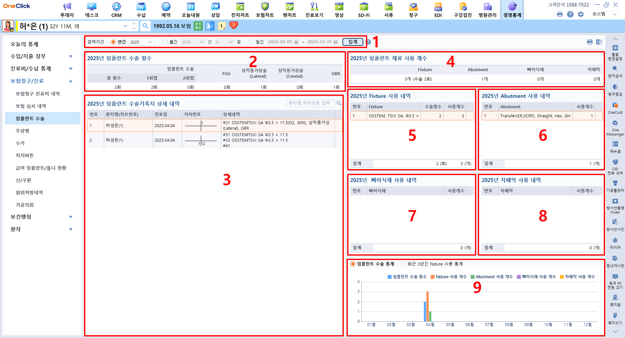 > **검색한 기간에 대한 병원의 임플란트 수술 횟수, Fixture 및 Abutment 사용 개수, 임플란트 수술 상세 내역, Fixture 및 Abutment 사용 내역 등의 임플란트 수술 통계를 확인할 수 있는 메뉴입니다.**